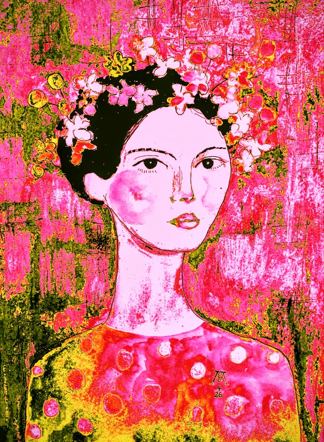8.4.2026 Frau mit rosafarbenen Blüten im Haar -