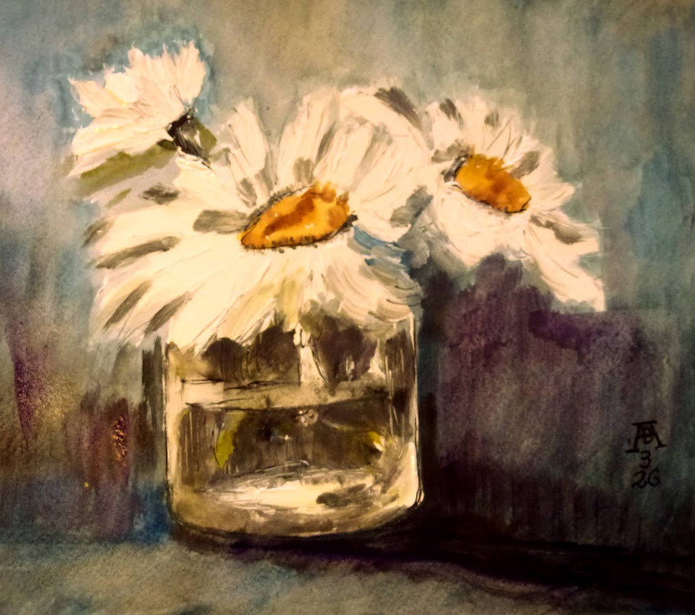 23.3.2026 Drei Margeritenblüten  in einer Glasvase -